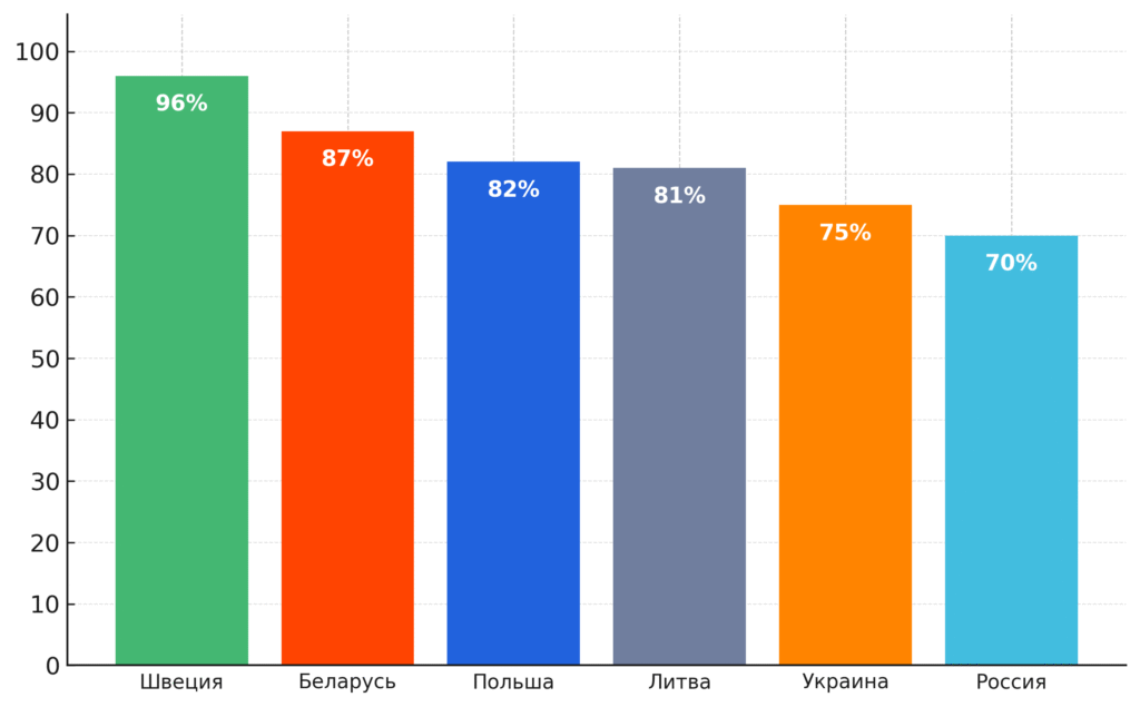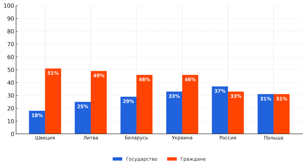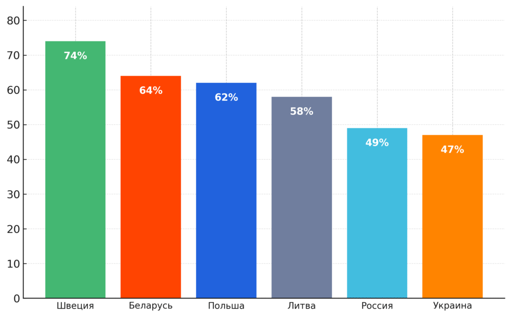 Беларусы также считают, что люди должны нести большую ответственность за свое обеспечение, чем государство. Аналогично считают в Украине, Литве, Швеции, тогда как в России и Польше люди чаще считают, что государство должно брать на себя большую ответственность за обеспечение своих граждан.