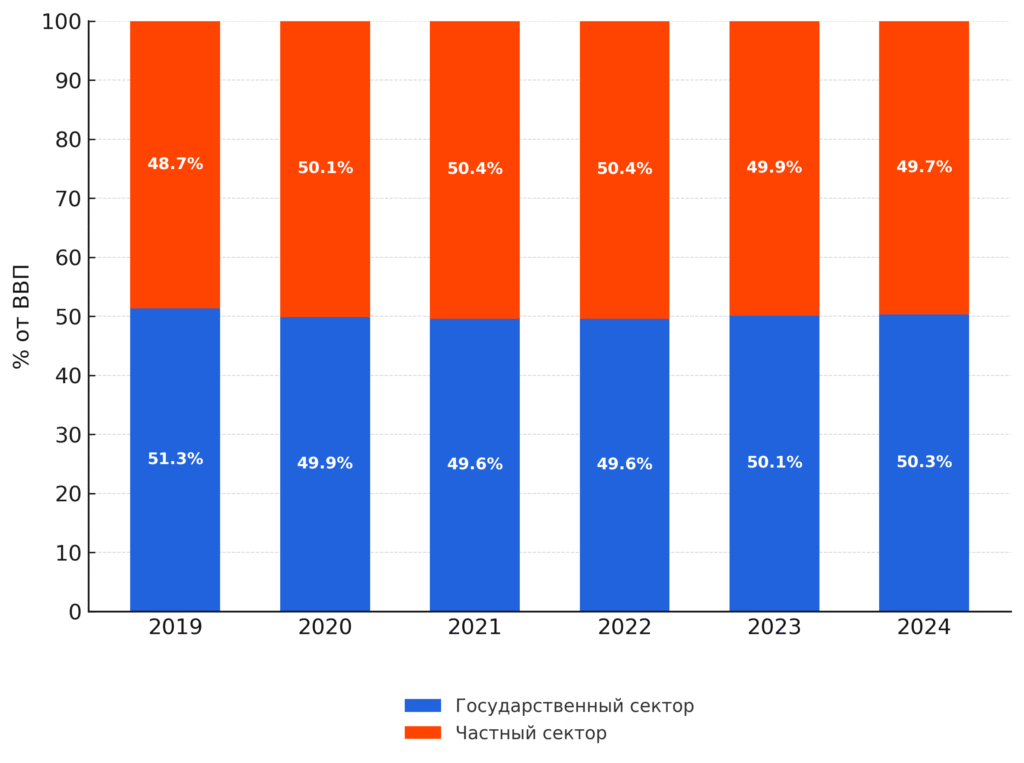Данные Белстата за 2019-2024 годы показывают, что доли государственного и частного секторов практически равны, а в отдельные годы частная собственность преобладала, пусть и совсем незначительно — преимущество составляло менее одного процента.
